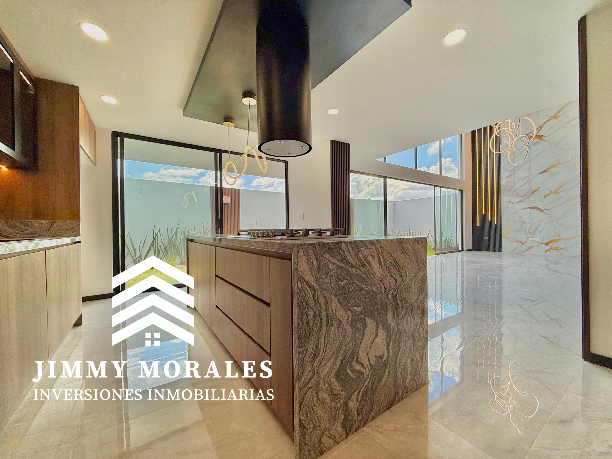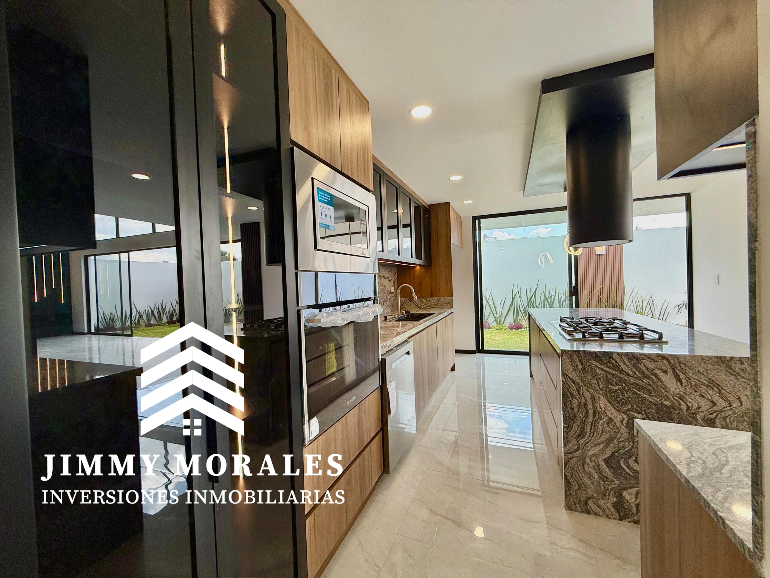 -Cocina abierta con barra de granito, parrilla en isla y torre de hornos